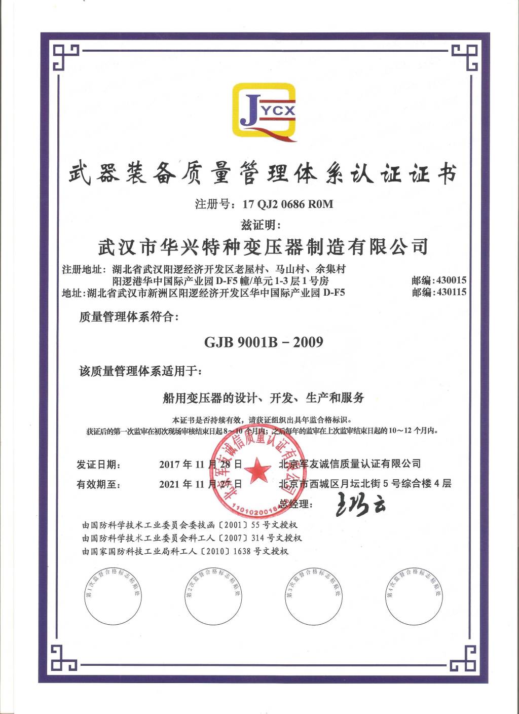 武器装备质量管理体系认证证书